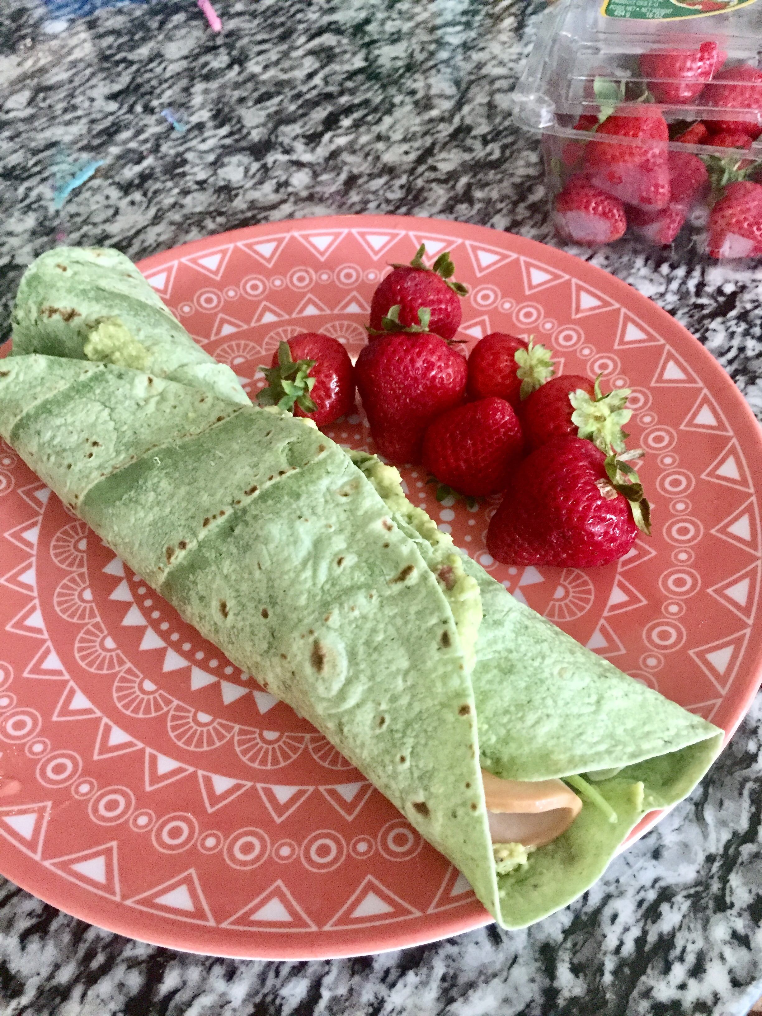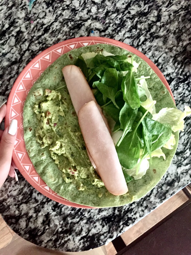 Ingredients + process: I use mission spinach tortillas and layer it with two table spoons of spicy guac that I get pre made (I literally buy an entire tub of guac for myself alone each week), grab a handful of organic spinach, and a handful of lettuce, add two slices of organic honey turkey, and wah lah! Wrap it up and take it to go or enjoy it at home.