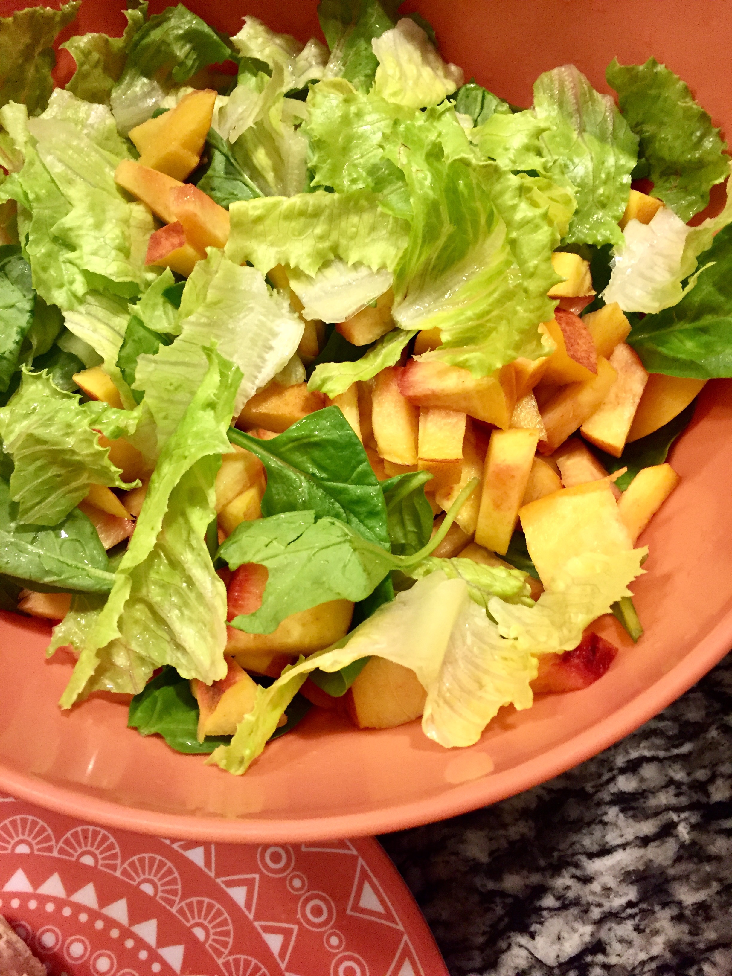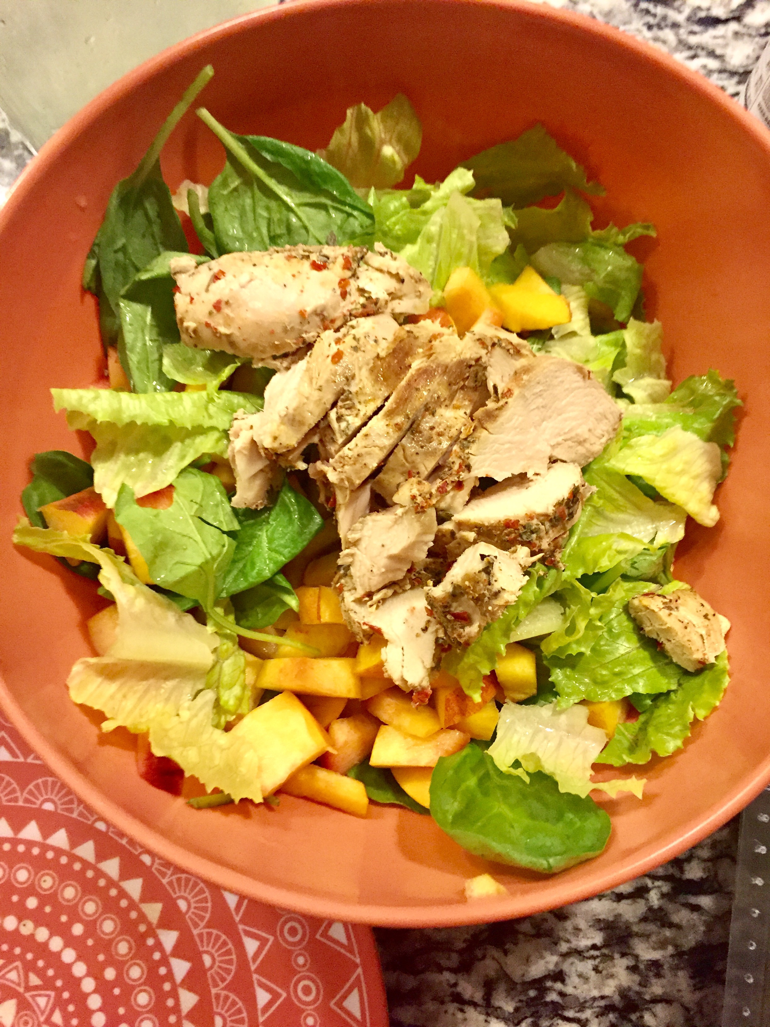 Something light and easy. As most of you know, I’m pretty big on clean eating. This meal is one of my go to meals! The spice in the chicken really brings out the flavor and balances the taste of the sweet peach with this salad.