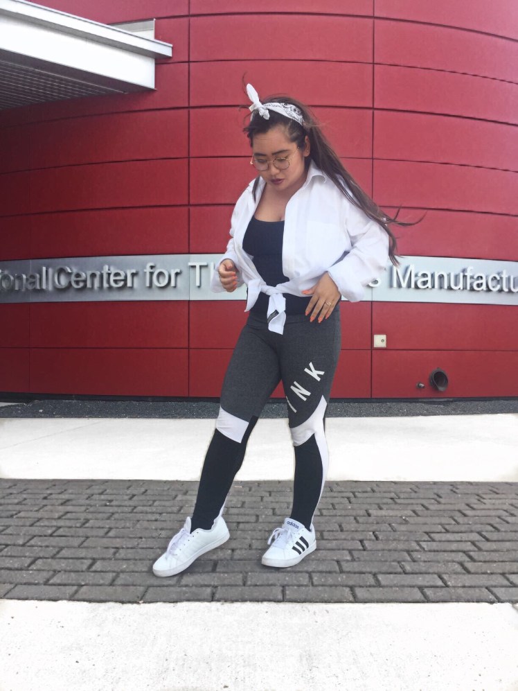 A bandanna to keep up your second day hair if you happen to have popped all of your hair ties like yours truly, a simple sports bra, black tank, leggings, and tennis shoes to seal this literally effortless look. After staying in all day you can head straight for the gym. In this quick outing to drop a friend off somewhere I grabbed my go to white button down collared shirt and tied the front for a circa 2000 type of vibe. It was windy and I couldn’t find a jacket. But hey, it was both fashionable and functional.