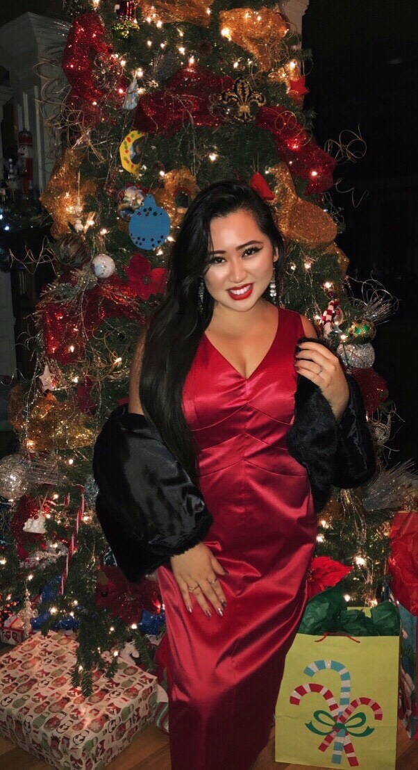 Family holiday gatherings and midnight mass. A Christmas tradition. I styled this silk red sleeveless body con dress with a v cut neckline, with a black faux fur coat that has a diamond flower clasp, black 4in strapped heels, and I accessorized it with dangly diamond earrings. As for makeup, I’ve been going with the usual bold red lip lately even if I’m just staying in to study.