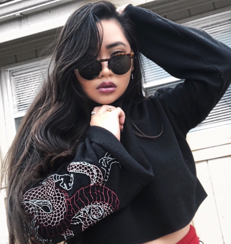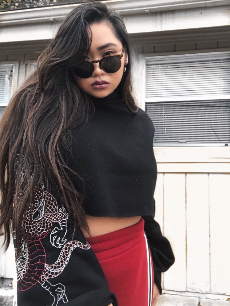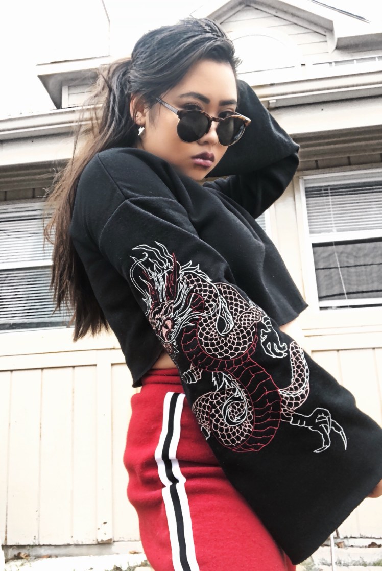 The 8hr drive to and from New Orleans to make it to my second home is always a long one. In order to make it more comfy this year I wore red track sweats, with a cropped black dragon embroidered bell sleeved hoodie, and paired it with two inch wide strapped black heels. I accessorized this look with my fav tortoise trimmed circle sunnies and silver tinker bell earrings that I haven’t worn since seventh grade simply because I couldn’t find any other earrings in my room back at home since I left all of my jewelry back at my apartment.