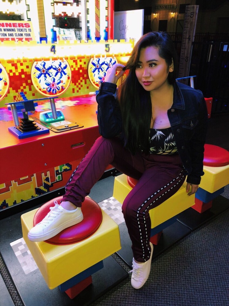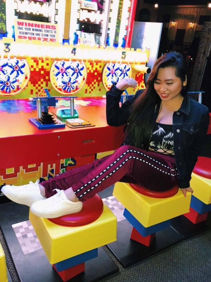 For this outfit I paired the red lined track pant, with the tropical black tube top, staple jean jacket, and Steve Madden white sneakers to top it all off for a casual look that I wore to the arcade and bowling social before I drove home to Dallas for the weekend.