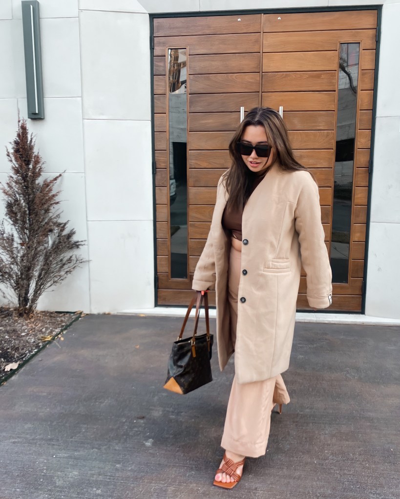 Lately I’ve been wearing monochrome outfits to keep things clean and sleek. I love neutrals and this nude longline coat is the perfect winter staple as it continues to get colder in the DFW area. It was actually hot last weekend and you could wear shorts during Christmas! The brown longlseeve shirt is also another one of my favorite staples that you can dress up or down. The tan pants are my go to. Flowy pants have been some of my favorite closet staples for the past four years because they’re so comfortable and it makes every outfit look timeless paired with a simple shirt. For my shoes I’m wearing brown square toed shoes to match the long sleeve shirt. Lately I’ve been pairing all my outfits with simple basic heels to elevate the look to the next level.